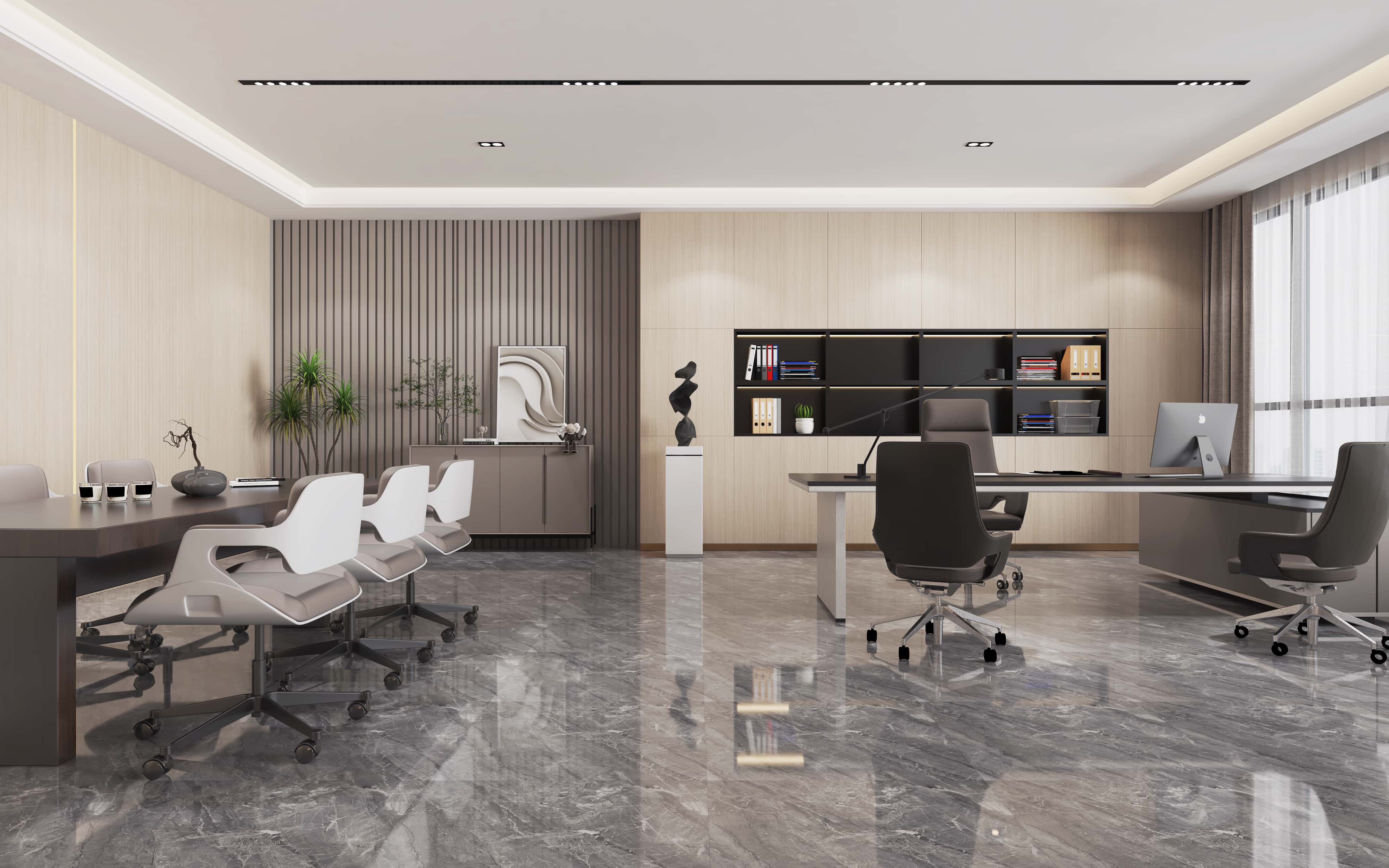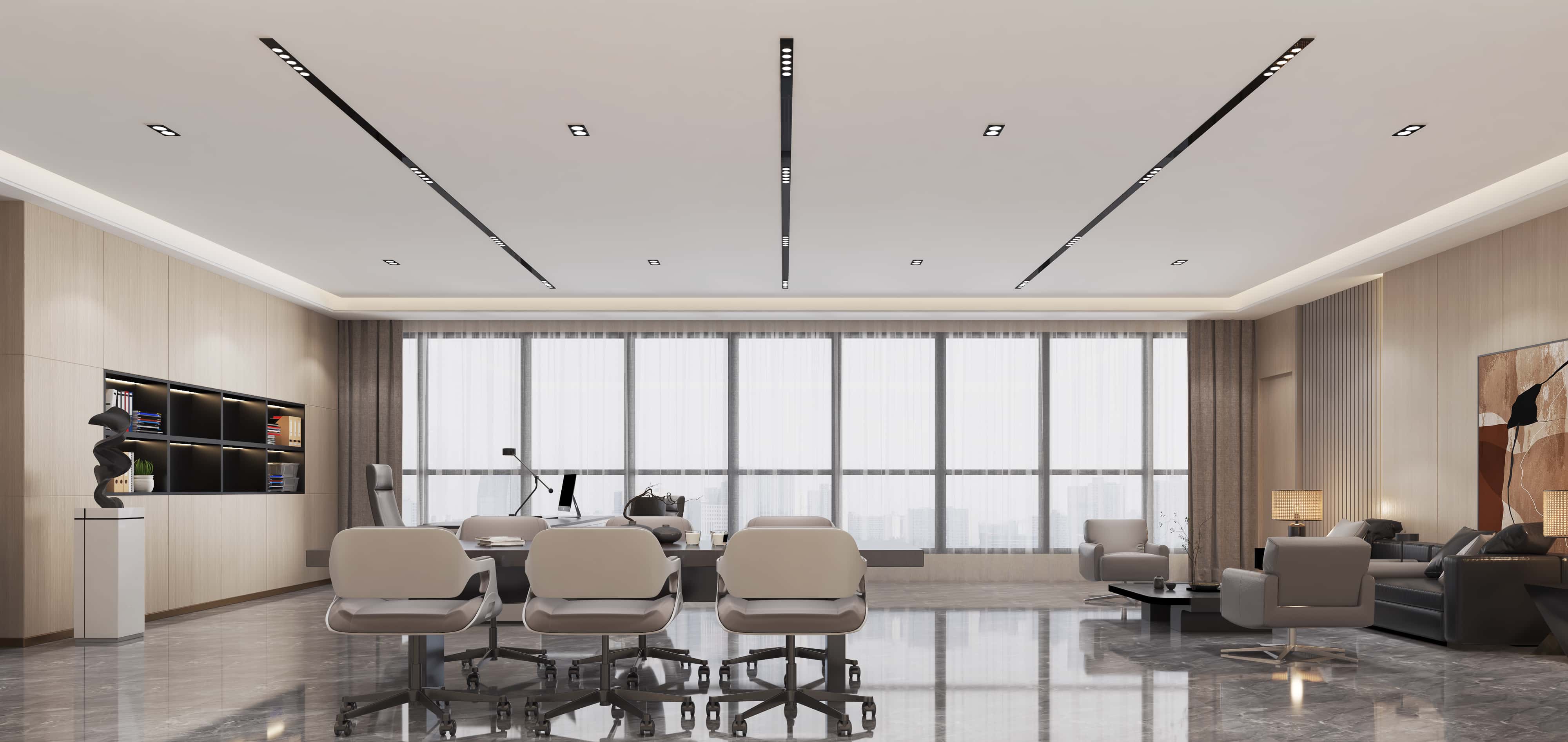 經理辦公室,淺木色墻板營造溫馨氛圍,大面積落地窗采光良好,辦公與休閑區(qū)布局合理,家具搭配協(xié)調,藝術擺件提升格調。