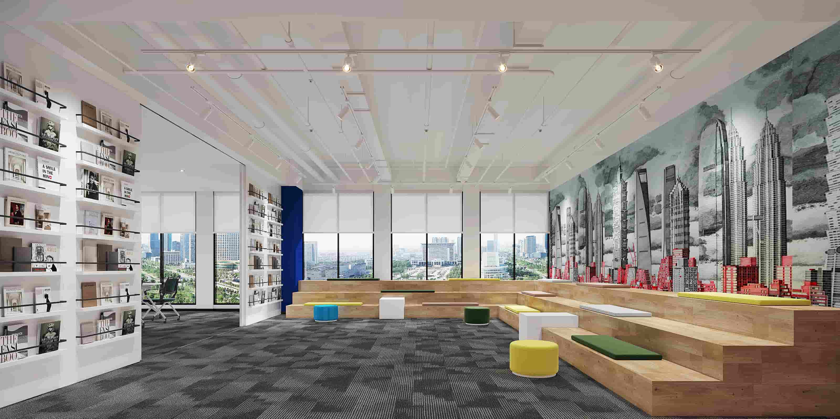 休閑區(qū)以白色為主調(diào),搭配橙色立柱與多彩家具,營造輕松氛圍,落地窗引入充足光線,窗外景色宜人。會議室兩側(cè)書架陳列書籍,增添文化氣息,藍(lán)色立柱與紅色墻面形成視覺沖擊。階梯區(qū)木質(zhì)階梯結(jié)合彩色坐墊,背景墻的城市景觀壁畫別具一格。辦公室內(nèi)色彩鮮艷的裝飾與簡潔的辦公家具相得益彰,綠植點(diǎn)綴生機(jī)。各處燈光設(shè)計柔和,照亮空間同時提升舒適度,旨在打造一個功能多樣、舒適且充滿創(chuàng)意的辦公環(huán)境。